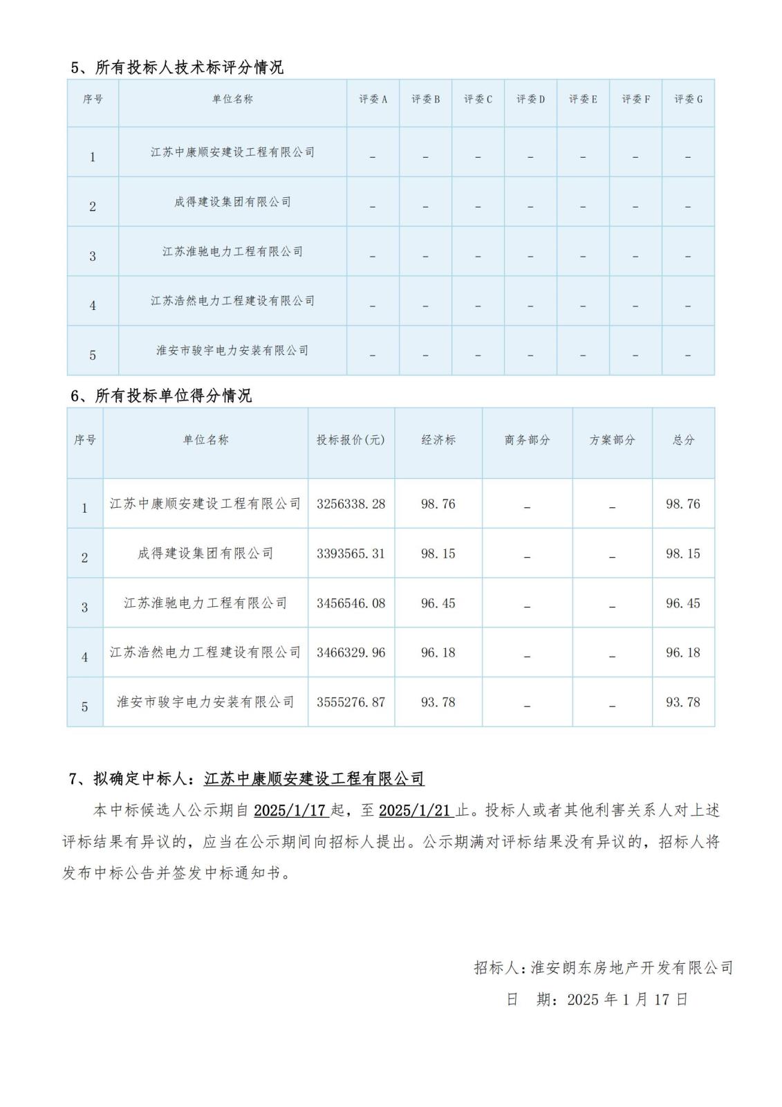 淮安朗东房地产开发有限公司PCB智能设备产业园光伏配套安装工程评标结果公示