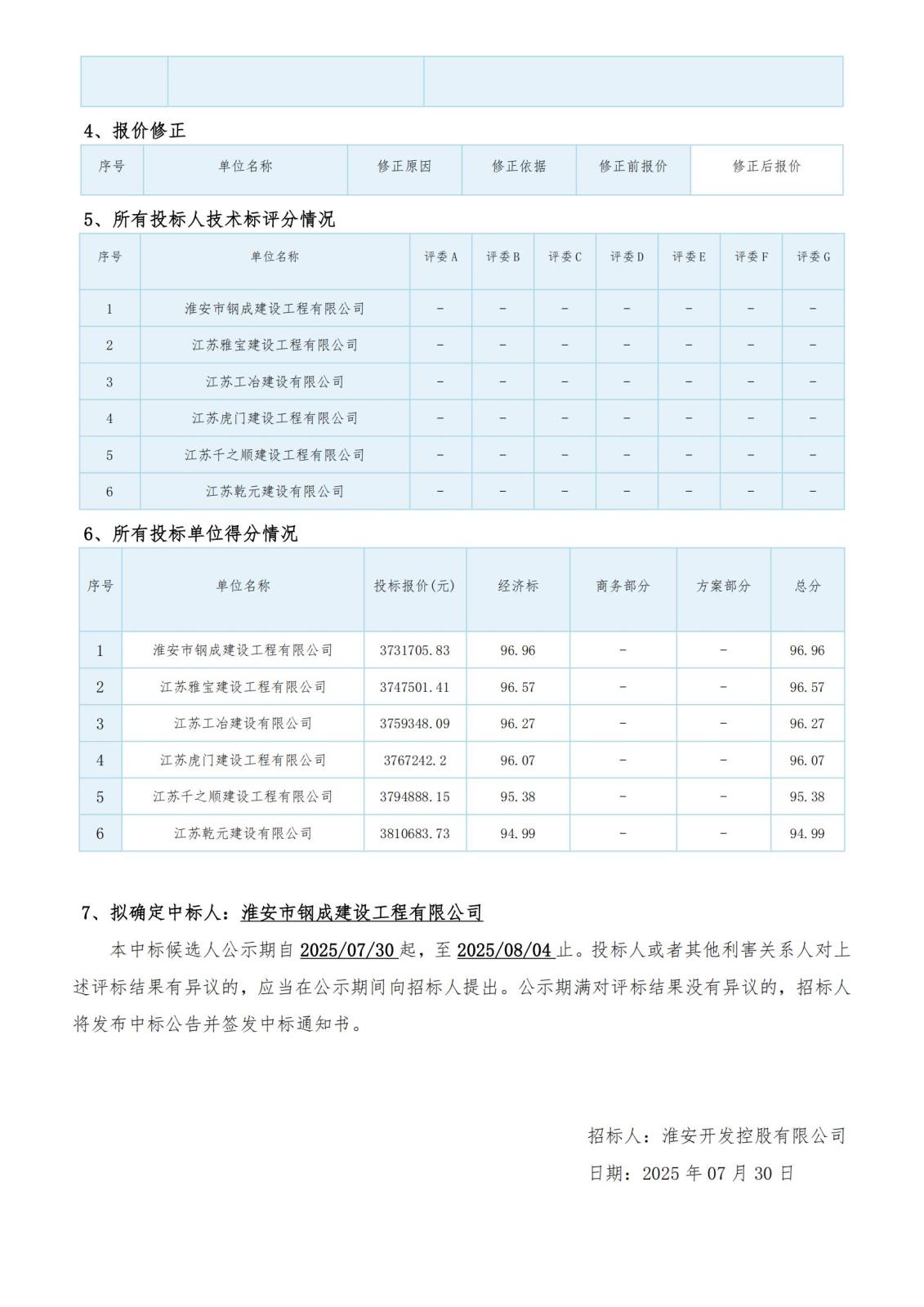 淮安开发控股有限公司东城江南 D1-D15 号楼维修工程评标结果公示