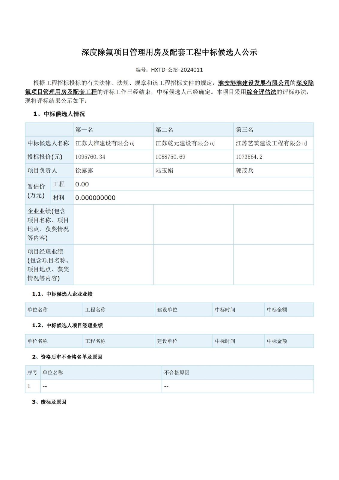 深度除氟项目管理用房及配套工程中标候选人公示